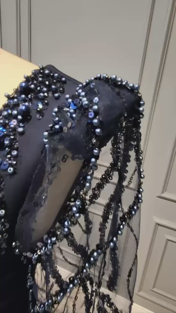 Elegant evening dress made from premium Italian double fabric, featuring beautifully embroidered sleeves. Length 160 cm. Available in navy, black, and beige. Perfect for special occasions.