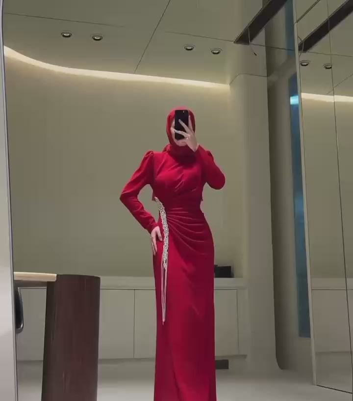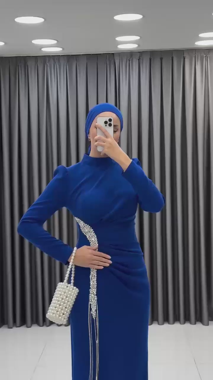 Elegant one-piece modest evening dress made from premium Turkish crepe, featuring a fixed accessory trim with pearl detailing. Perfect for special occasions.