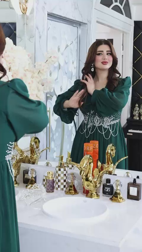 Elegant one-piece modest dress designed for plus sizes, made from premium chiffon and embellished with diamond accessories and chain details at the waist. Length 155 cm. Perfect for special occasions.